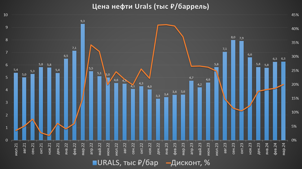 Цены на нефть марки BRENT в 2023 году были на высоких отметках, но в среднем на 20% ниже год к году. Российская нефть марки Urals торгуется с дисконтом к BRENT. Сейчас он в районе 20%. Цены на Urals в рублях во второй половине прошлого года благодаря девальвации были на высоких отметках. Правда, из-за начавшегося укрепления рубля в течение четвертого квартала цены снизились на 25%. Последние 5 месяцев средняя цена Urals 6100₽ за баррель.