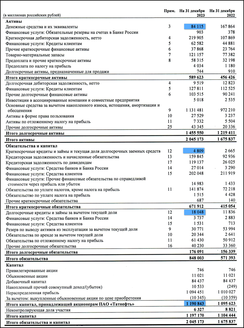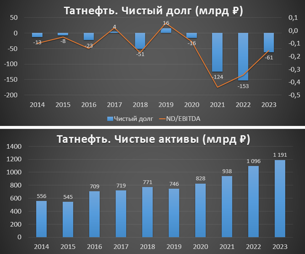 Таким образом, чистый долг отрицательный -61,3 млрд. Хотя в 2022 году было минус -153 млрд. Но в любом случае, финансовое положение отличное.