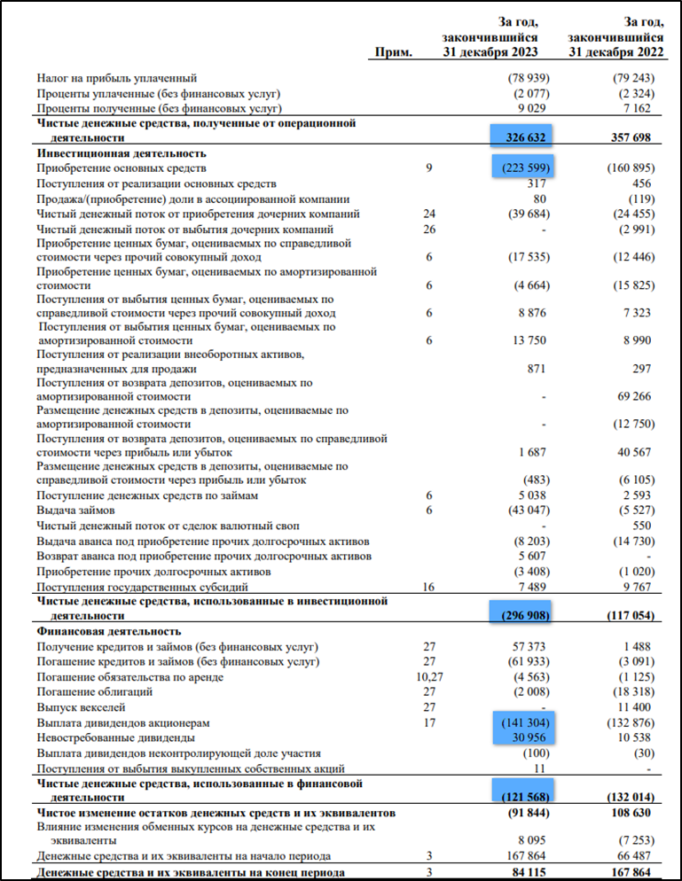 финансовая деятельность -121,5 млрд (-8% г/г). Здесь основная статья — это выплата дивидендов 141 млрд. Правда, 31 из них – это невостребованные дивиденды.