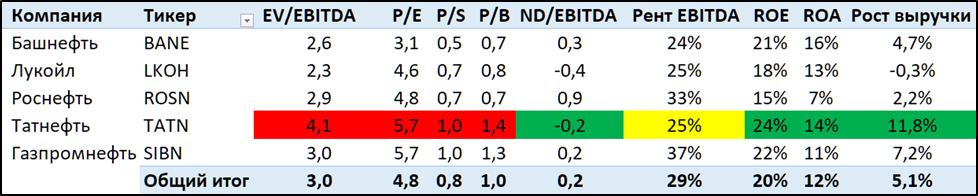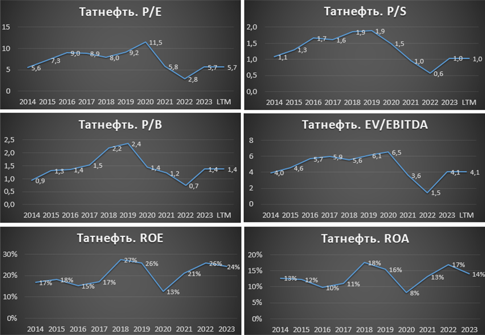 Относительно нефтегазовых компаний, которые уже отчитались за 2023 год, Татнефть оценивается выше среднего. Правда, у нее и рентабельность капитала немного выше и выручка растет побыстрее.