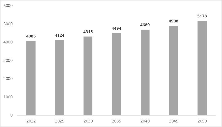 Прогнозируемое потребление электроэнергии в США в период с 2022 по 2050 г., ТВт⋅ч