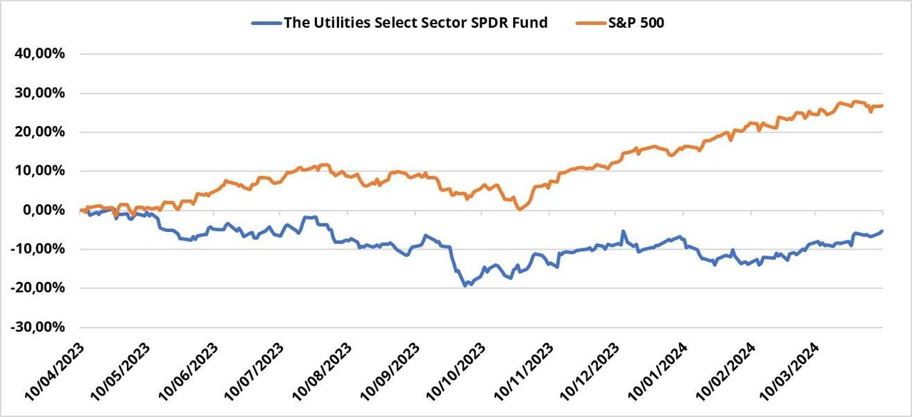 Последние 12 месяцев были не самыми удачными для акций коммунального сектора США. Динамика стоимости The Utilities Select Sector SPDR Fund (-5,3%) значительно отстала от динамики американского индекса широкого рынка S&P 500, который за это время подрос на 26,8%.