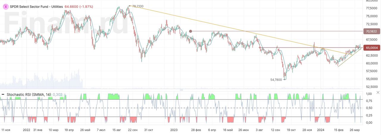 На дневном графике XLU можно увидеть, что инструменту удалось переломить долгосрочный понижательный тренд, который наблюдался с осени 2022 года. С середины февраля XLU сформировал тренд роста и сейчас близок к достижению локальных максимумов. Кроме того, ETF тестирует важный уровень сопротивления на отметке около $ 65, после пробития которого откроется путь до $ 70.