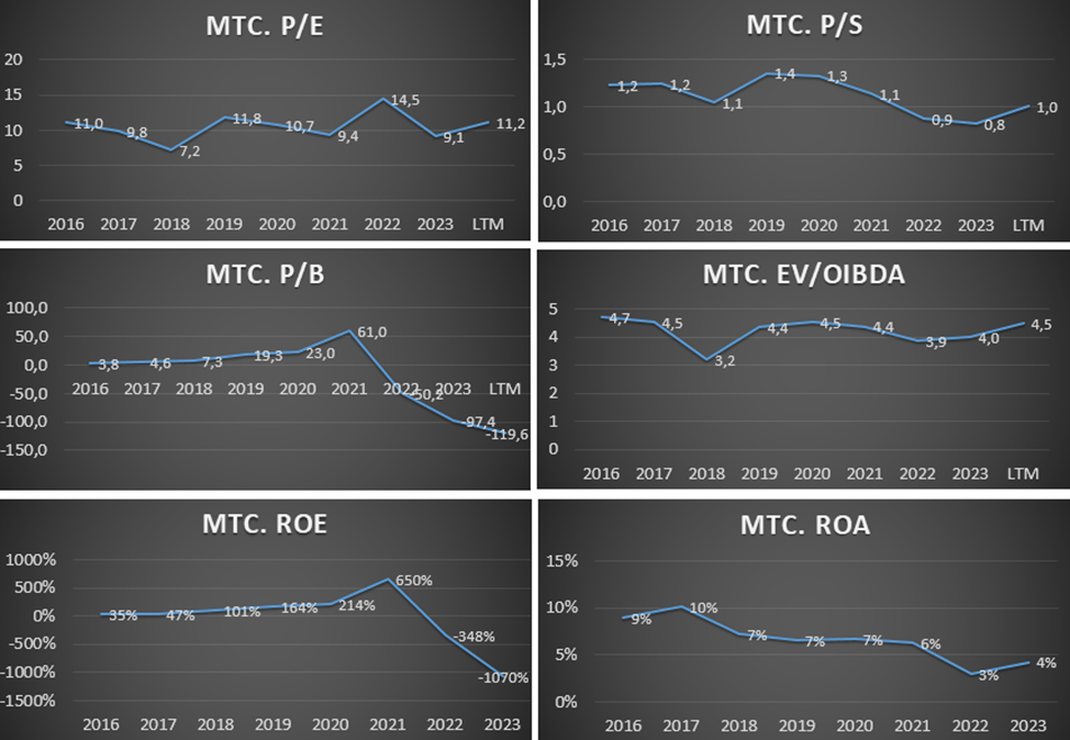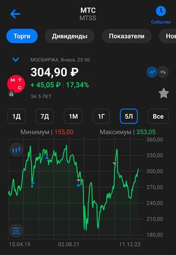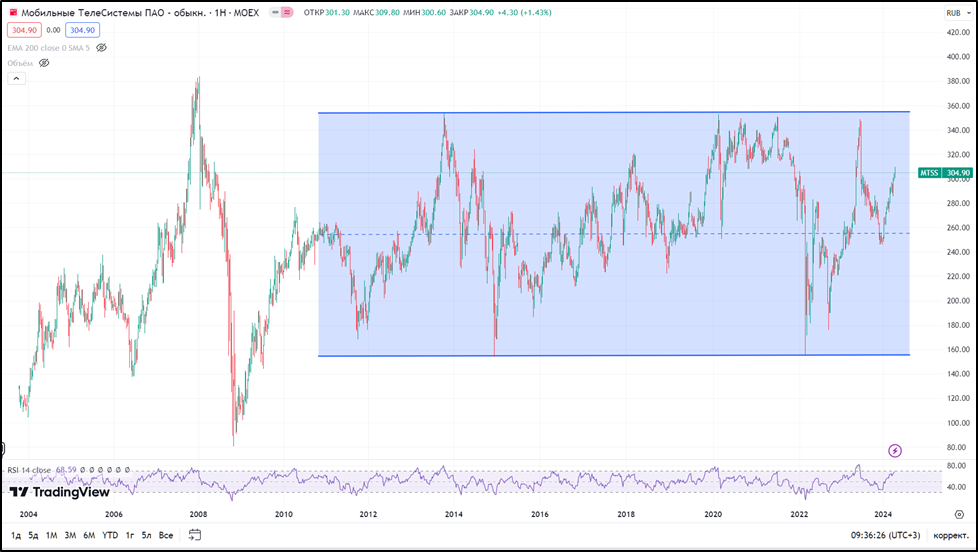 Акции МТС торгуются на бирже 20 лет. За 2023 год рост котировок составил примерно 5%. И на данный момент акции торгуются в верхней половине своего исторического диапазона. С начала 2024 года рост составляет 23%.