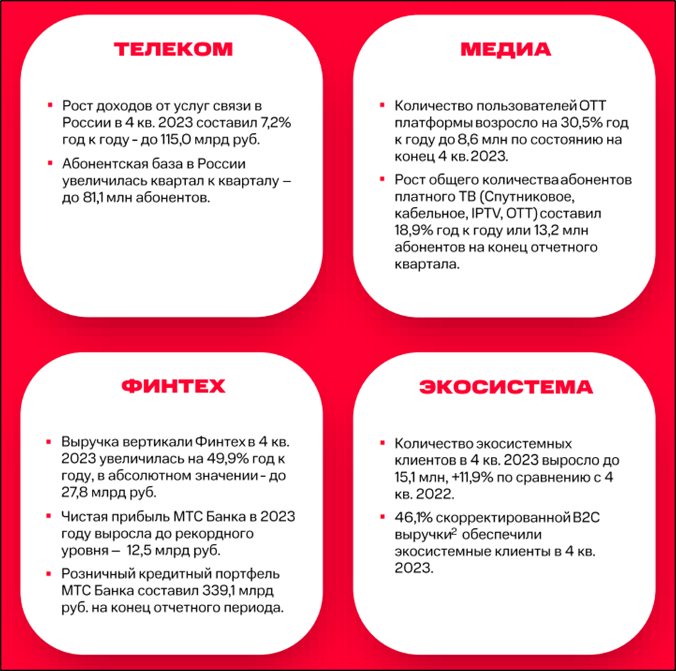 Также компания владеет МТС банком, что позволяет ей оказывать банковские и финансовые услуги. МТС формирует облачные решения, где планирует стать ведущим частным поставщиком в России. А также имеет свою экосистему. В частности, активно развивается онлайн-кинотеатр KION.