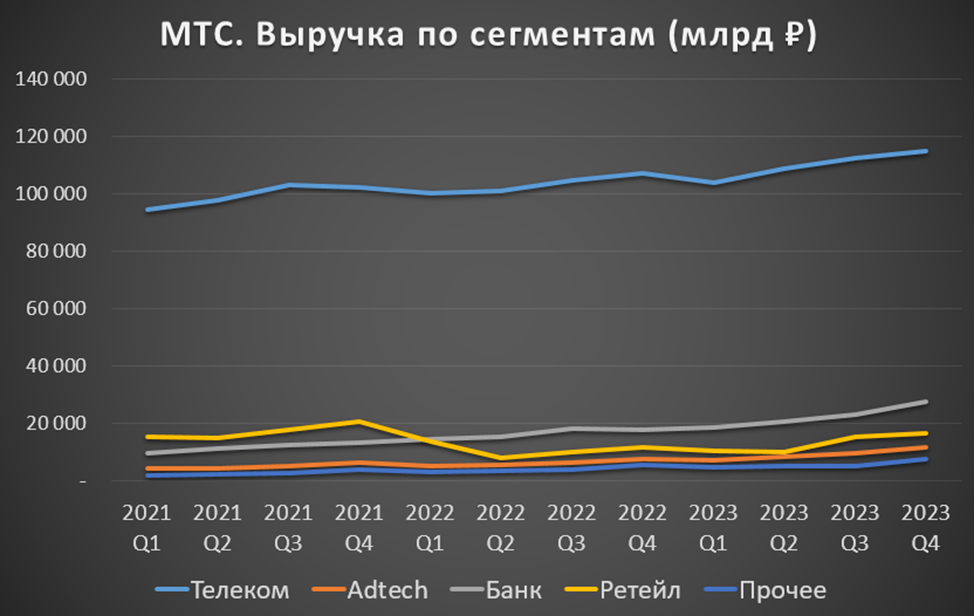 Структура выручки: 73% телеком, 15% Банк, 9% Ретейл, 6% Adtech, 4% Прочее.