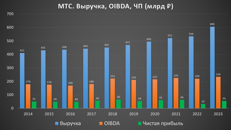 Выручка и OIBDA в 2023 году рекордные, ЧП на 67% выше г/г, но это одно из самых низких значений за последние 7 лет. Средние темпы роста выручки около 6% в год, OIBDA 1% в год.