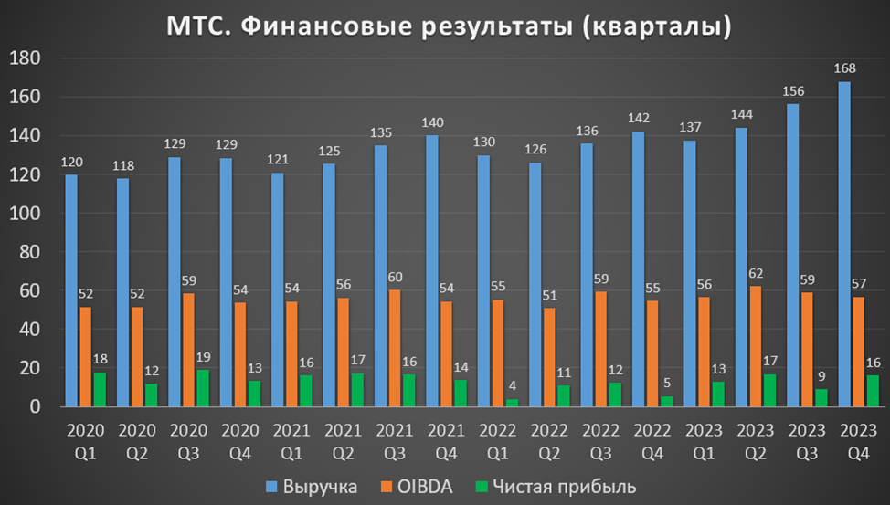 4Q 23 получился в целом неплохим, выросла выручка на 7%, а ЧП на 79% (за счет прочих доходов от переоценки ценных бумаг), но правда, OIBDA снизилась 4% кв/кв.