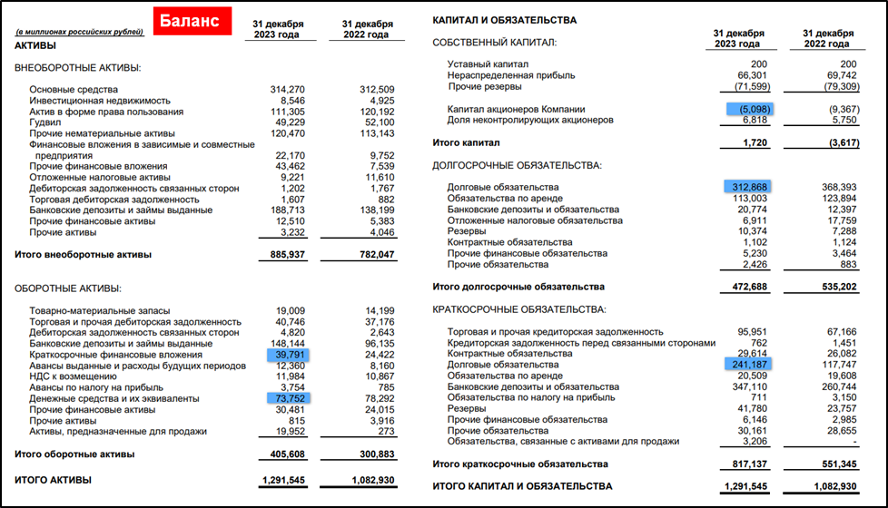 У компании высокая долговая нагрузка и отрицательные чистые активы. Денежные потоки и кап затраты 2023г. средние. Компания платит стабильно достаточно высокие дивиденды. Но для того, чтобы долг начал сокращаться, необходимо каким-то образом увеличить доходы, либо сильно урезать кап затраты/инвестиции/дивиденды.