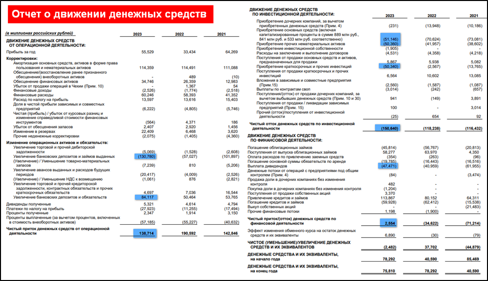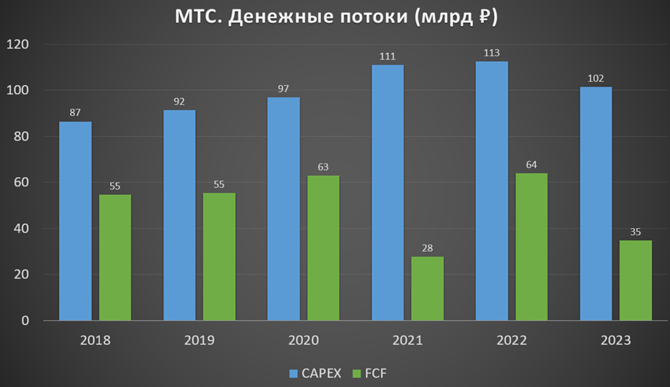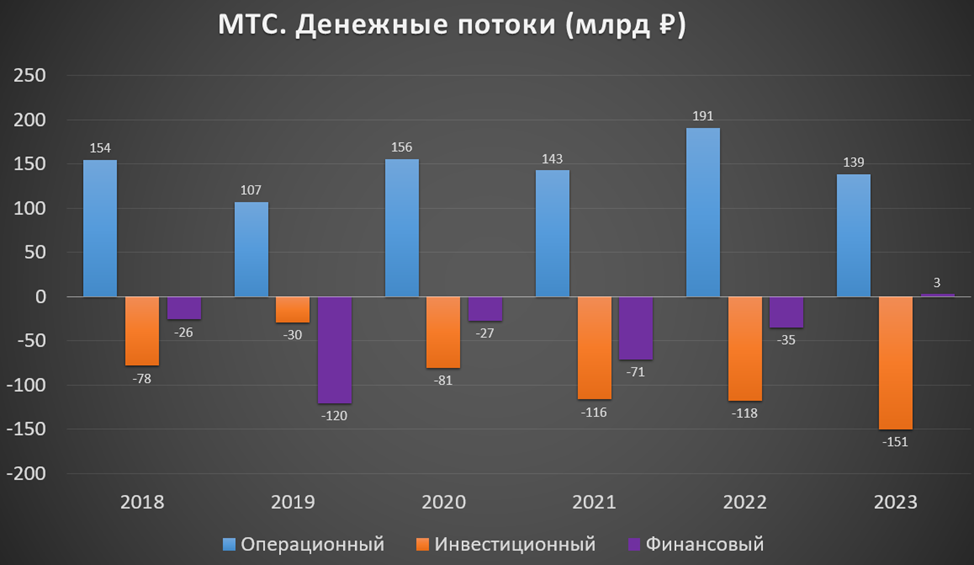 операционная деятельность 138,7 млрд (-27% г/г). Именно столько денег поступило в компанию за год. Падение в основном из-за снижения депозитов в МТС Банке.