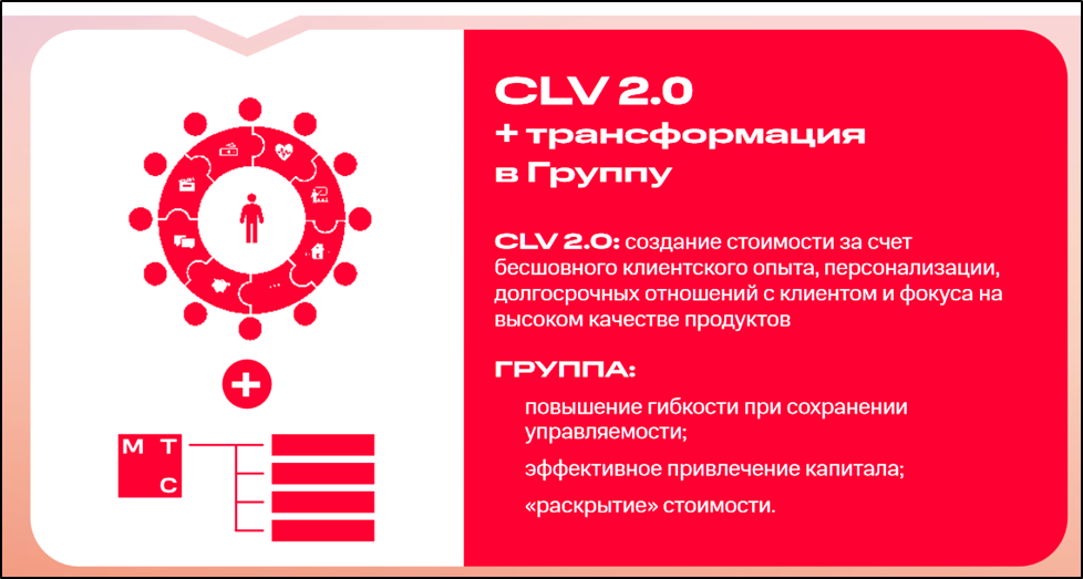 Текущая стратегия компании CLV 2.0 (Customer Lifetime Value 2.0 ) связана с развитием цифровых продуктов и экосистемы на базе сильного телекоммуникационного бизнеса.