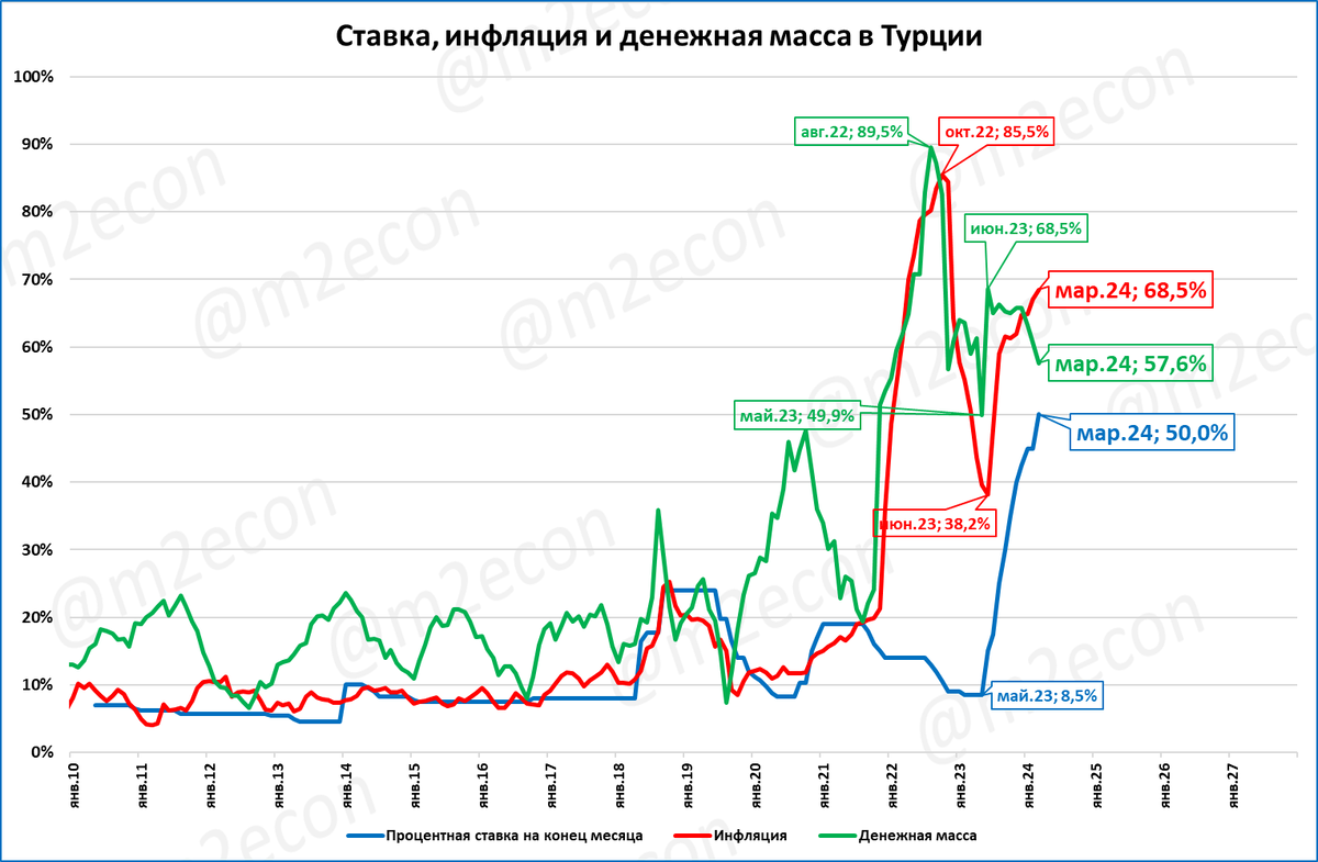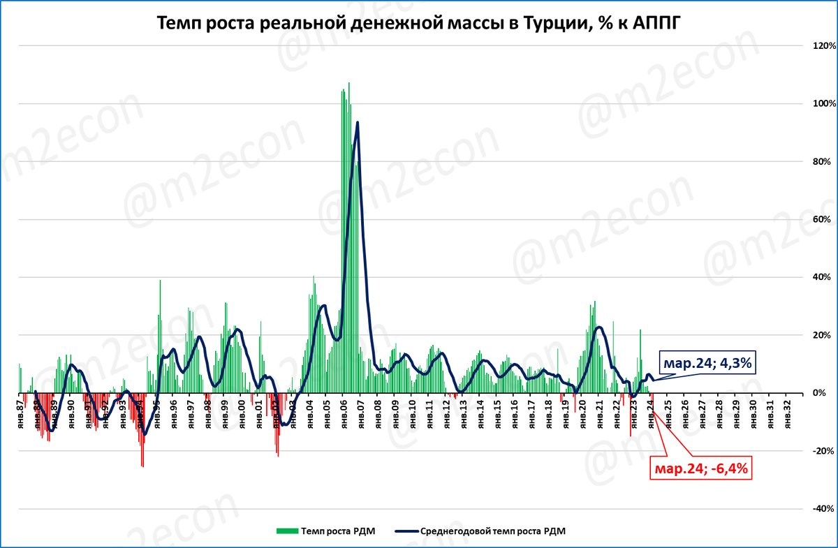 В Турции денежная масса в реальном выражении сжимается уже третий месяц подряд. Проблема: ЦБ повышает ставки нерешительно и к тому же тормозит рост денежной массы.