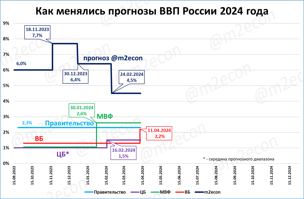 Напомню, что наш текущий прогноз предполагает рост ВВП в 2024 году на 4,5%. Новые данные для пересмотра этого прогноза появятся, когда Росстат опубликует данные по ВВП за 1 квартал.