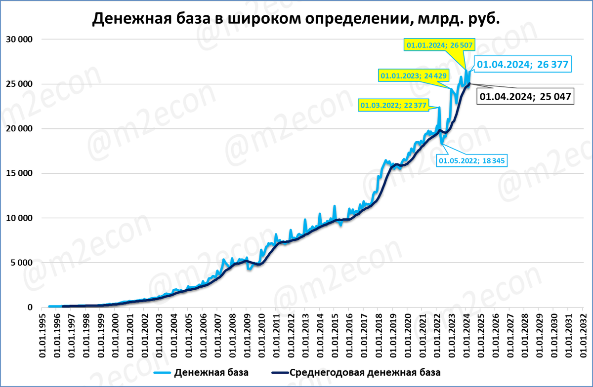 На 1 апреля 2024 года широкая денежная масса (ДБ) составила 26,4 трлн рублей