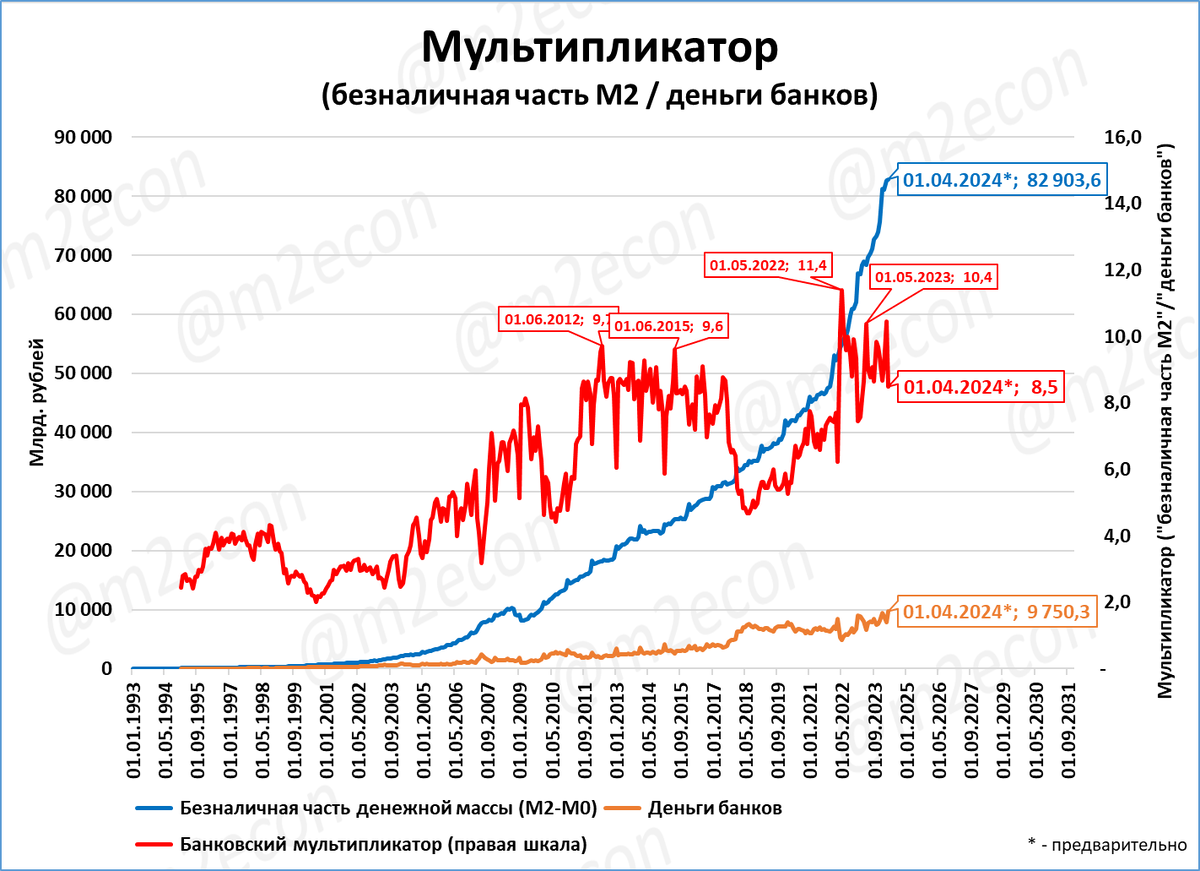 Это означает, что деньги банков (9,75 трлн. руб.) в 8,5 раза меньше, чем безналичная часть денежной массы (82,9 трлн. руб.).