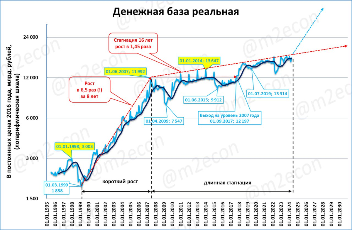 Голубая стрелка показывает, какой рост реальной денежной базы необходим для быстрого роста ВВП.