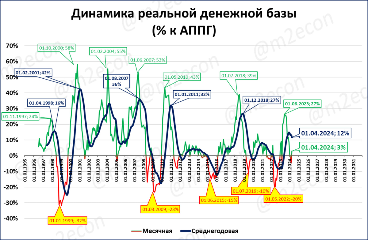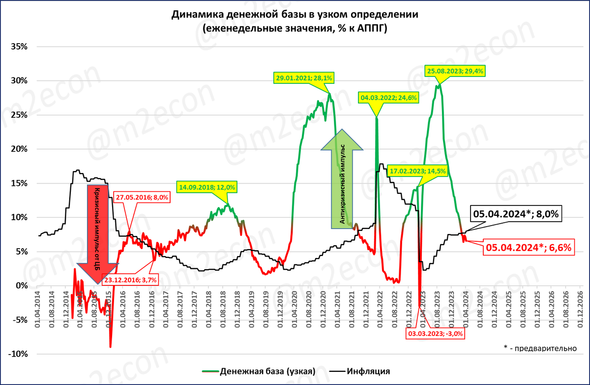 Узкая денежная база в апреле продолжает сжиматься в реальном выражении (негатив).