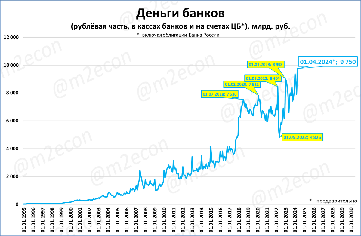 Деньги банков на 1 апреля установили исторический рекорд, поднявшись до 9,75 трлн рублей.