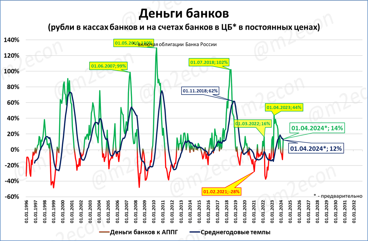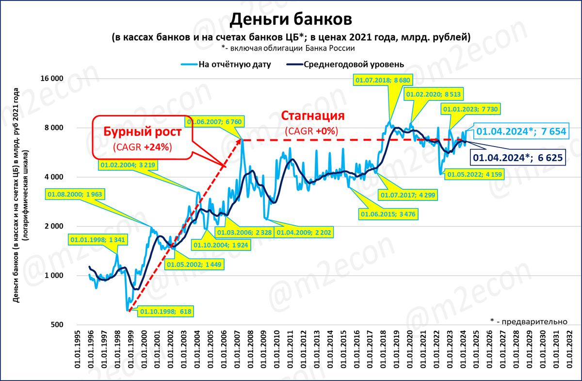 Но это номинальные величины. Если учесть инфляцию, то в реальном выражении (в постоянных ценах 2021 года) деньги банков далеки не только от исторического рекорда 2018 года, но и от локальных рекордов 2020 и 2023 годов.