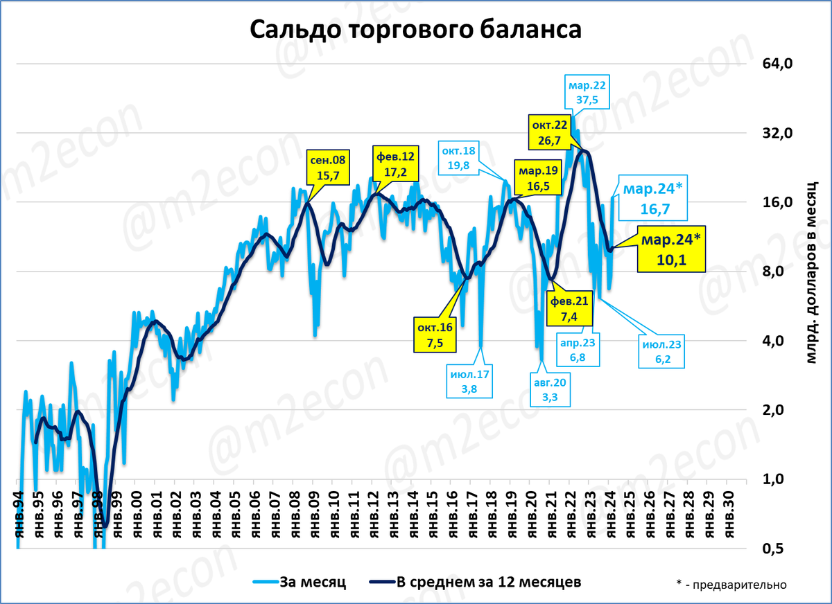 По предварительной оценке ЦБ, сальдо торгового баланса в марте составило 16,7 млрд. долларов.