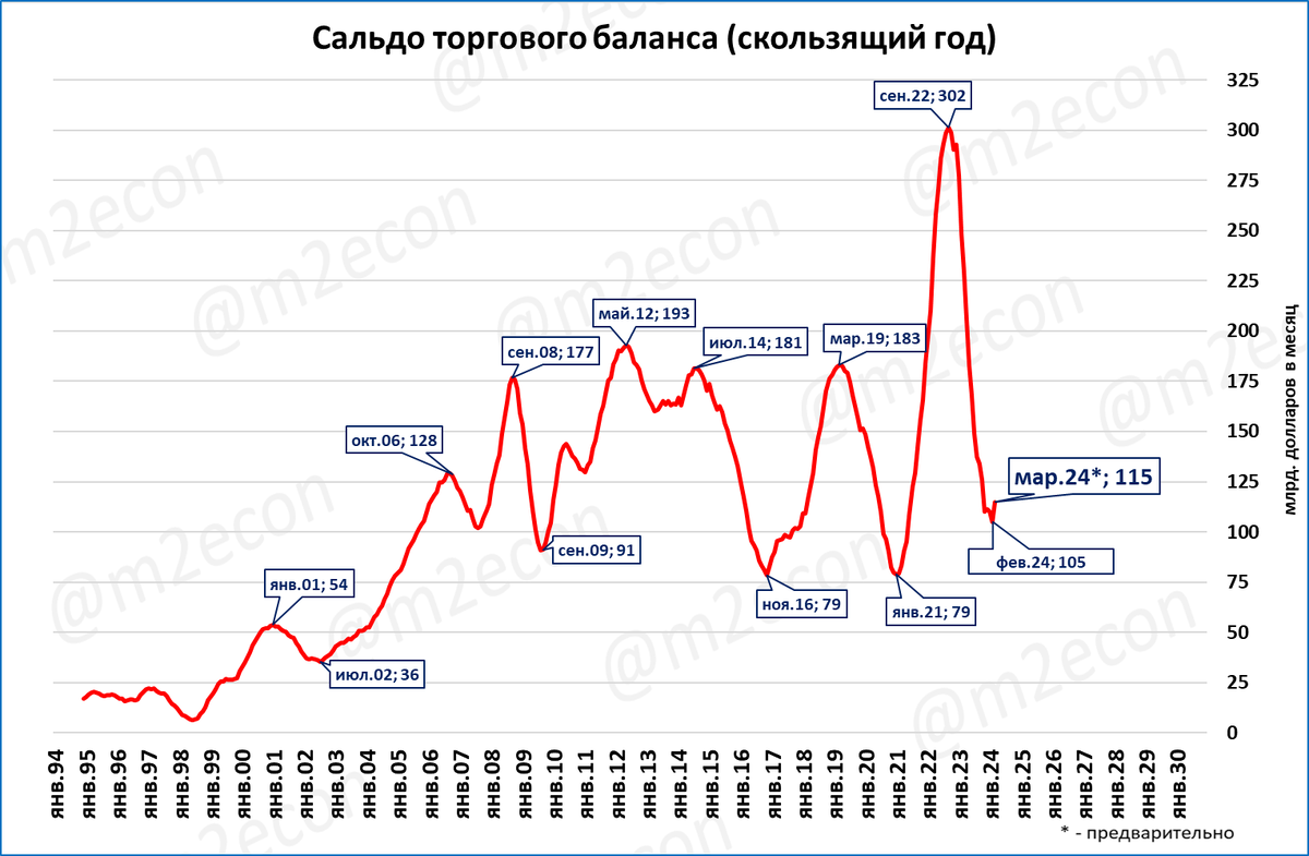 Сальдо за последние 12 месяцев (скользящий год) составило 115 млрд. долларов.