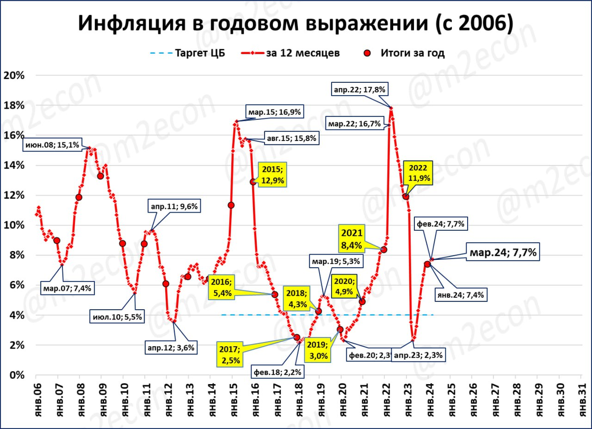 Таким образом, годовая инфляция стала максимальной в нынешнем цикле, незначительно превысив итоги февраля (7,69%).