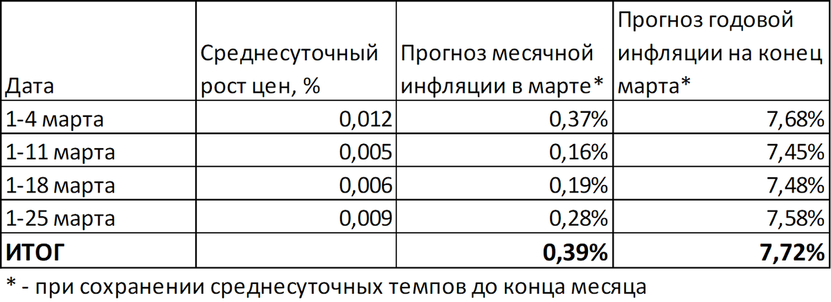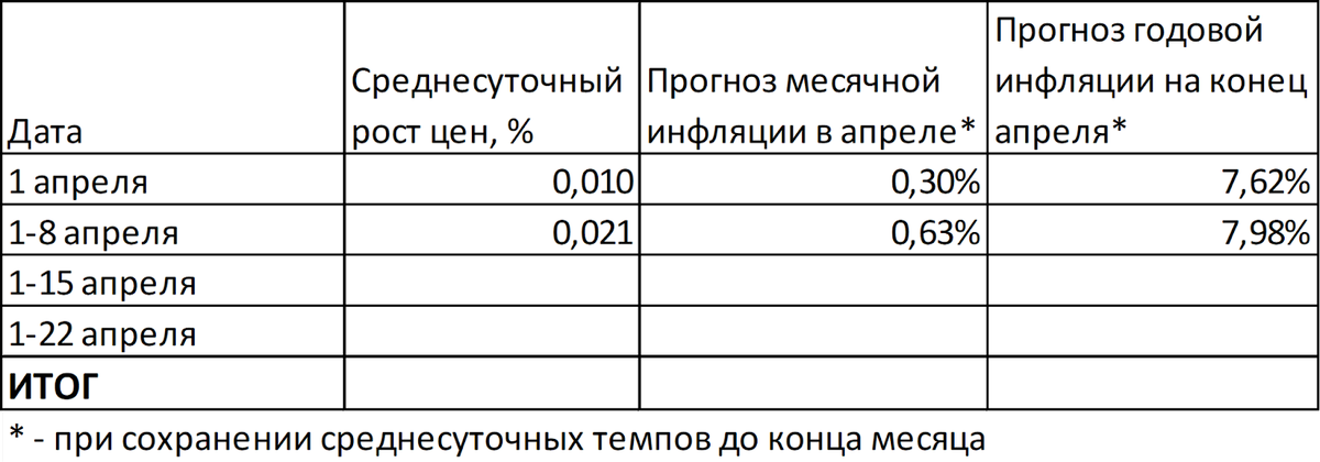 Если такой темп сохранится до конца апреля, то по его итогам инфляция вырастет до 7,98% годовых.