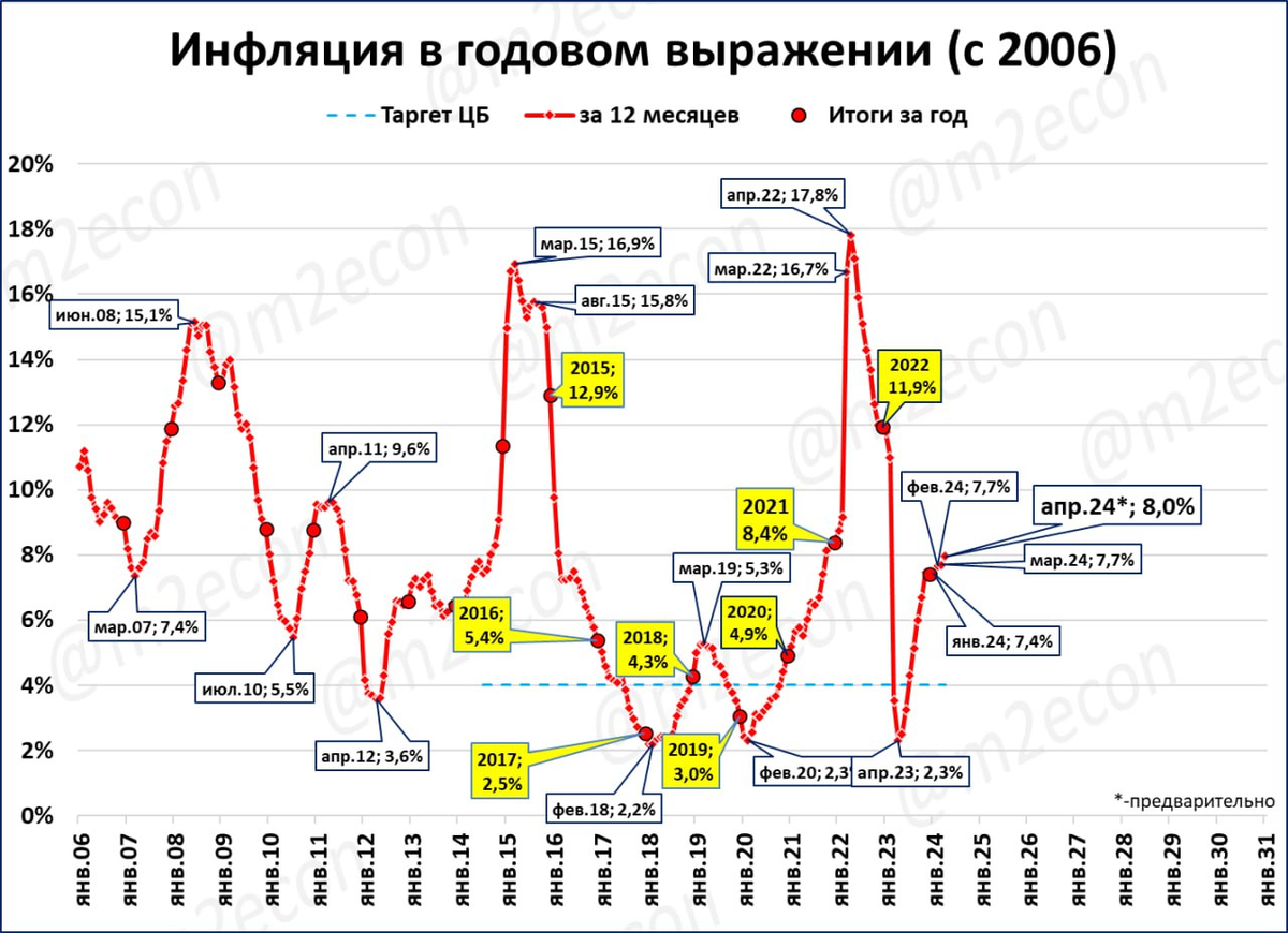 В этом сценарии к концу года инфляция составит порядка 8%, что далеко от заявленных целей и прогнозов ЦБ.