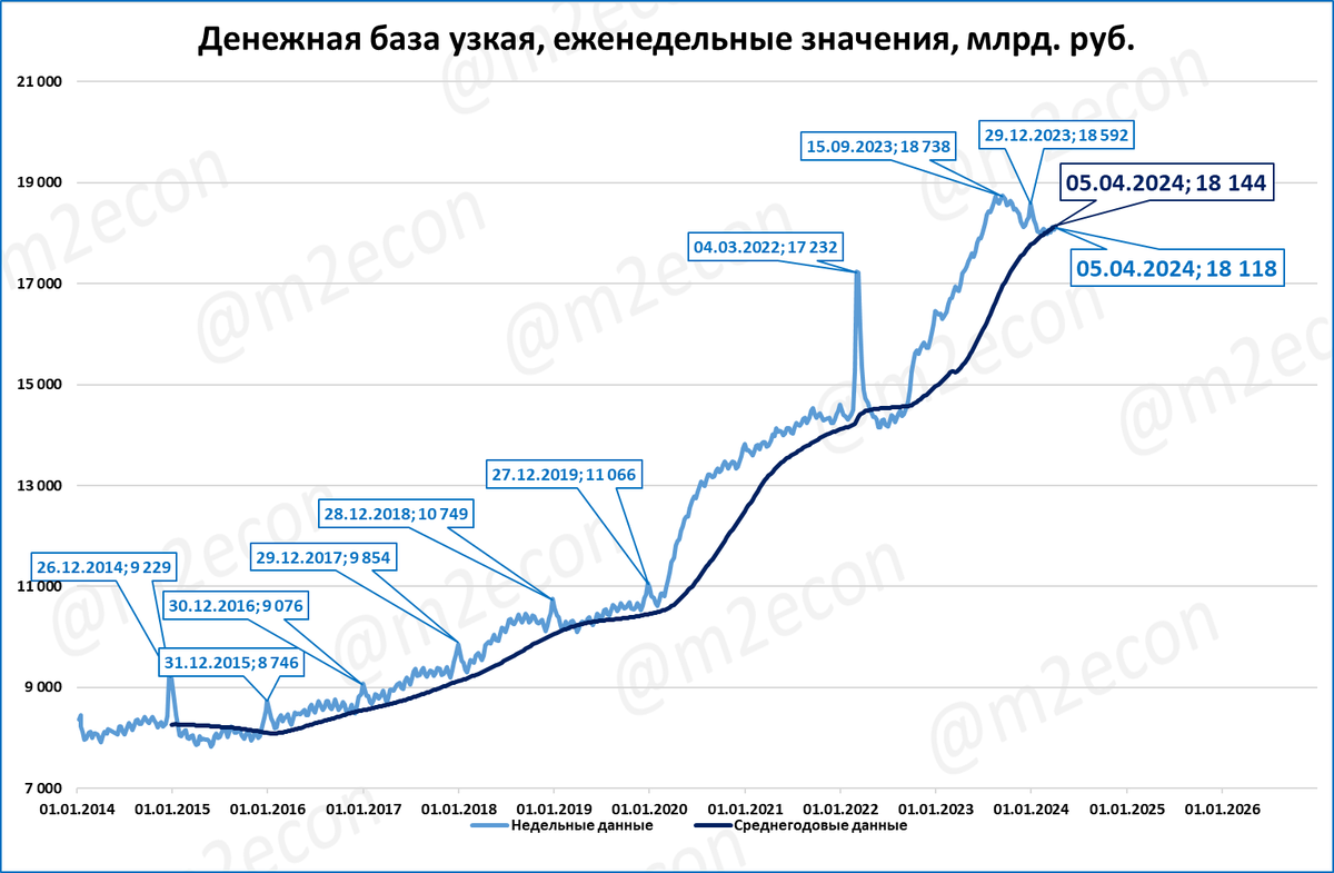 Как сообщает ЦБ, узкая денежная база на 5 апреля составила 18,1 трлн рублей.