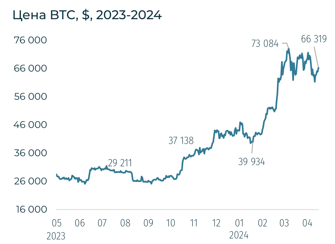 Награда за добытый блок BTC снижена вдвое. C 20 апреля награда майнеров BTC за добытый блок составит 3,125 BTC (~$200 тыс.). В два раза меньше, чем с 2020-го по 2024-й. CEO Marathon Digital Фред Тиль в начале апреля заявлял, что «халвинг» уже в цене BTC. Coinbase заявили, что позитивный импульс, связанный с событием, уже мог произойти, отмечая обновление рекордной отметки для BTC. Майнеры получали по 50 BTC за первые 210 тыс. блоков добытые в сети (2009-2012). Потом по 25 BTC (2012-2016), 12,5 BTC (2016-2020), 6,25 BTC (2020-2024). Сейчас добыто 94% от доступного предложения BTC. Последний BTC будет предположительно добыт в 2140-м году.