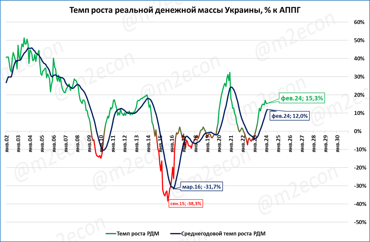 С декабря 2023 темпы роста денежной массы в России опустились ниже 20% и продолжают снижаться и сейчас. На Украине денежная масса до сих пор растёт темпом выше 20% годовых.