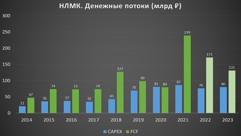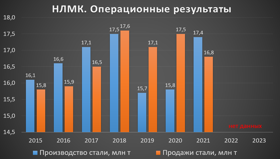 НЛМК не раскрывает последние операционные результаты. Но по данным за 9 месяцев 2022 года производство было без изменений, а продажи выросли на 4% г/г. Скорей всего, операционные показатели последних двух лет чуть хуже уровня 2021 года.