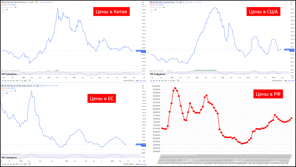 Цены на сталь во всём мире имеют схожую динамику. С максимумов 2021 года цены на стальные фьючерсы упали ориентировочно в два раза. Но последний год они находятся в боковике.