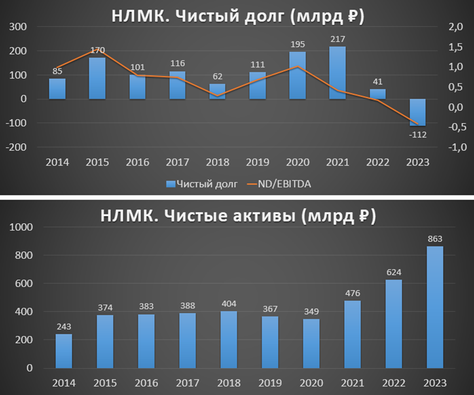 Финансовые результаты 2023 года достаточно высокие и уступают только 2021 году. Но при этом второе полугодие оказалось слабее первого. У НЛМК отрицательный чистый долг, что говорит об отличной финансовой устойчивости. Свободный денежный поток самый низкий за последние 3 года.