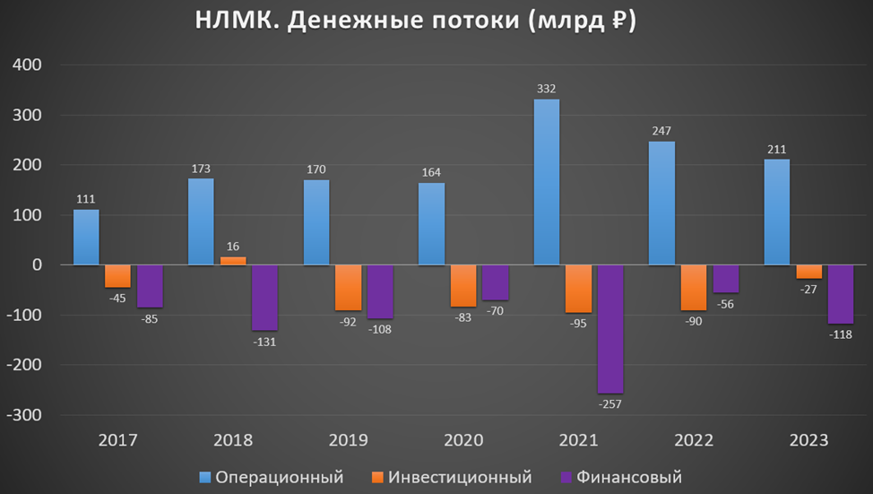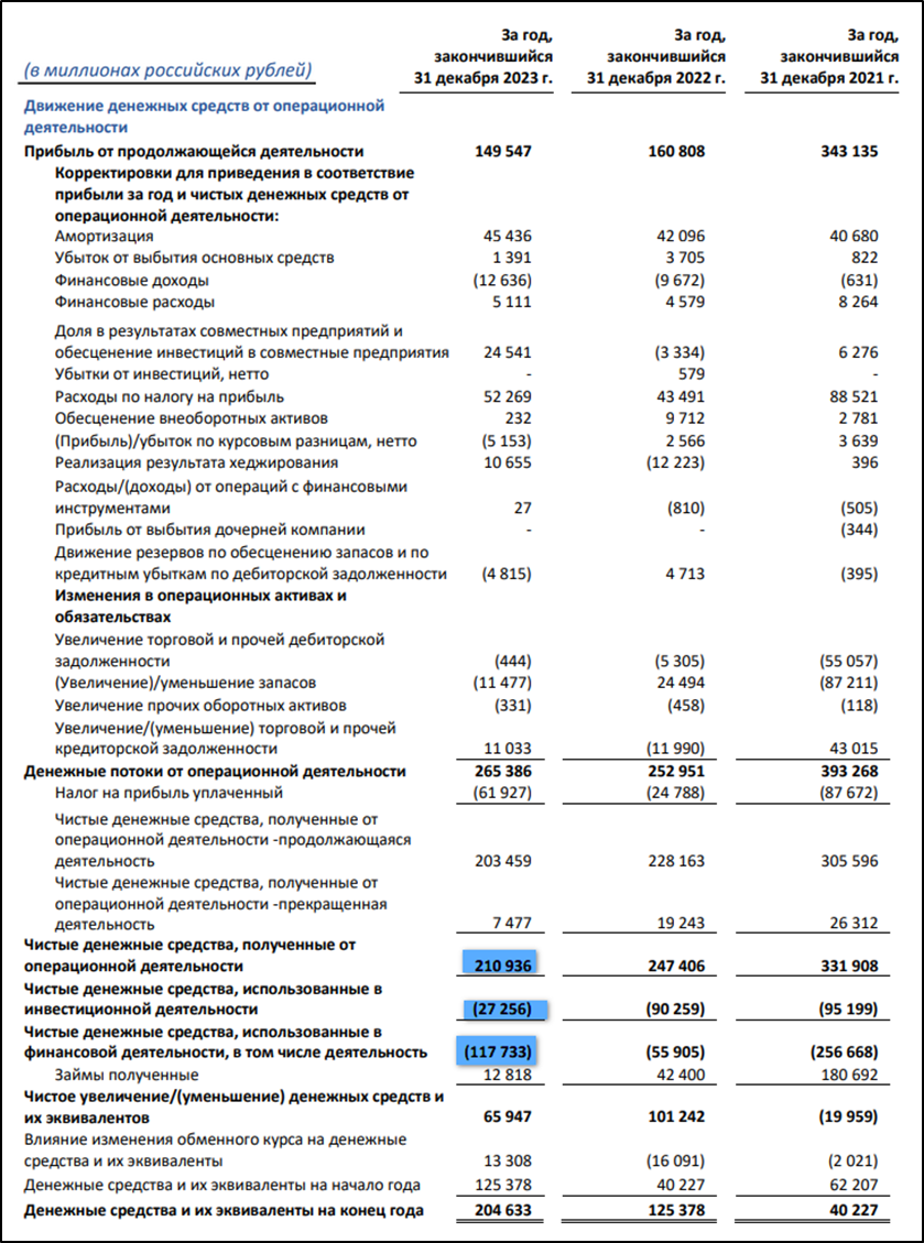 операционная деятельность 211 млрд (-15% г/г). Именно столько денег поступило в компанию за год. Причина снижения – более высокие выплаты по налогу на прибыль.