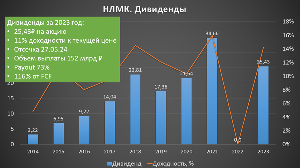 В случае одобрения акционерами, НЛМК отправит на дивиденды более 152 млрд, что составляет 116% от свободного денежного потока и 73% от чистой прибыли.