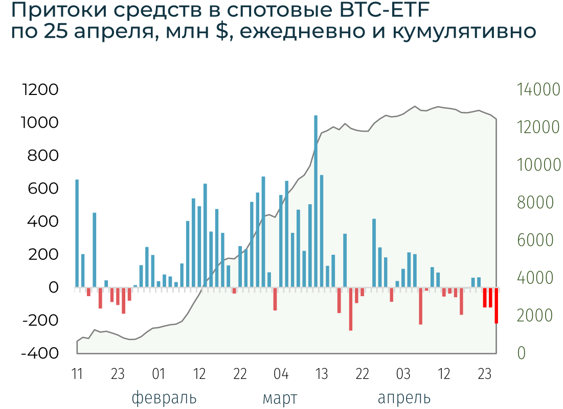 С 30 апреля клиринговая и расчетная компания DTCC не принимает криптопродукты в качестве залога. Также 30 апреля запущены к торгам первые 6 спотовых BTC и ETH ETF в Гонконге. По предварительным данным China Asset Management — притоки в BTC-ETF в 6 раз превышают притоки в ETH-ETF. Объемы торгов на момент написания составляют $12 млн (против $4,6 млрд в первый день в США). Австралийская ASX Ltd., на которую приходится ~4/5 объемов торгов акциями в стране, согласно источникам Bloomberg, может одобрить споовые BTC-ETF до конца 2024-го.