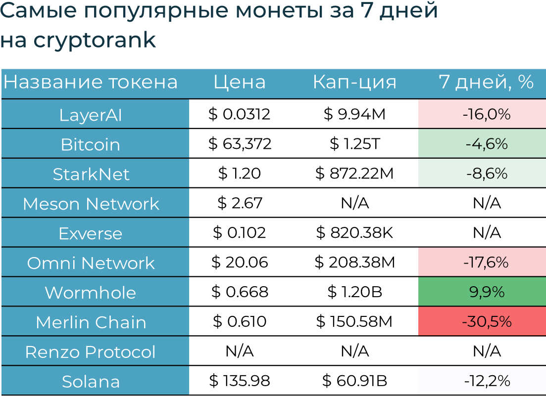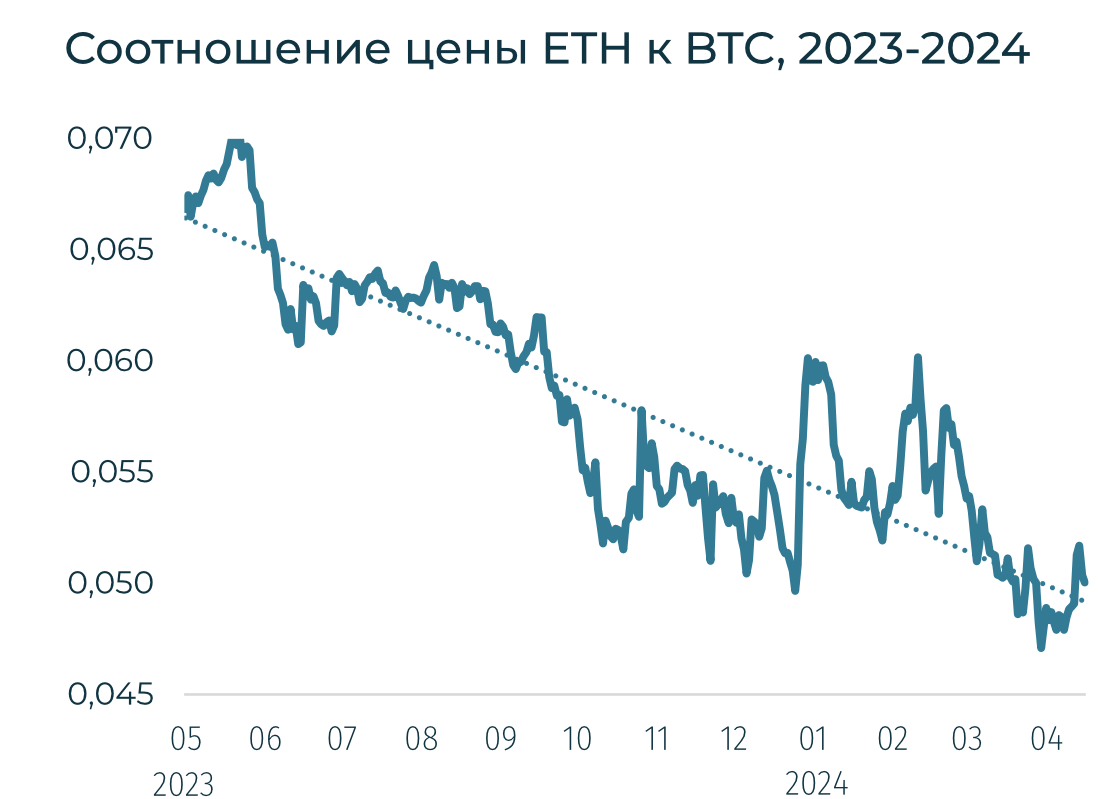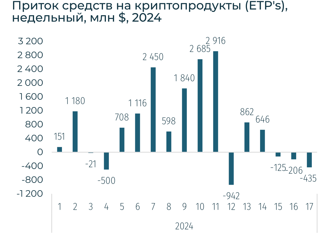 Ключевые криптовалюты снизились на фоне опасений стагфляции в США: темпы роста цен ускорились, а рост ВВП в Q1 2024 оказался гораздо ниже ожиданий. Ожидания длительной ограничительной монетарной политики в США усилили давления на котировки. За неделю BTC подешевел на 4,6% до $63,4 тыс., Ethereum — снизился на 1,5% до $3,2 тыс. Отток из криптопродуктов (ETP) усилился до -$435 млн.
