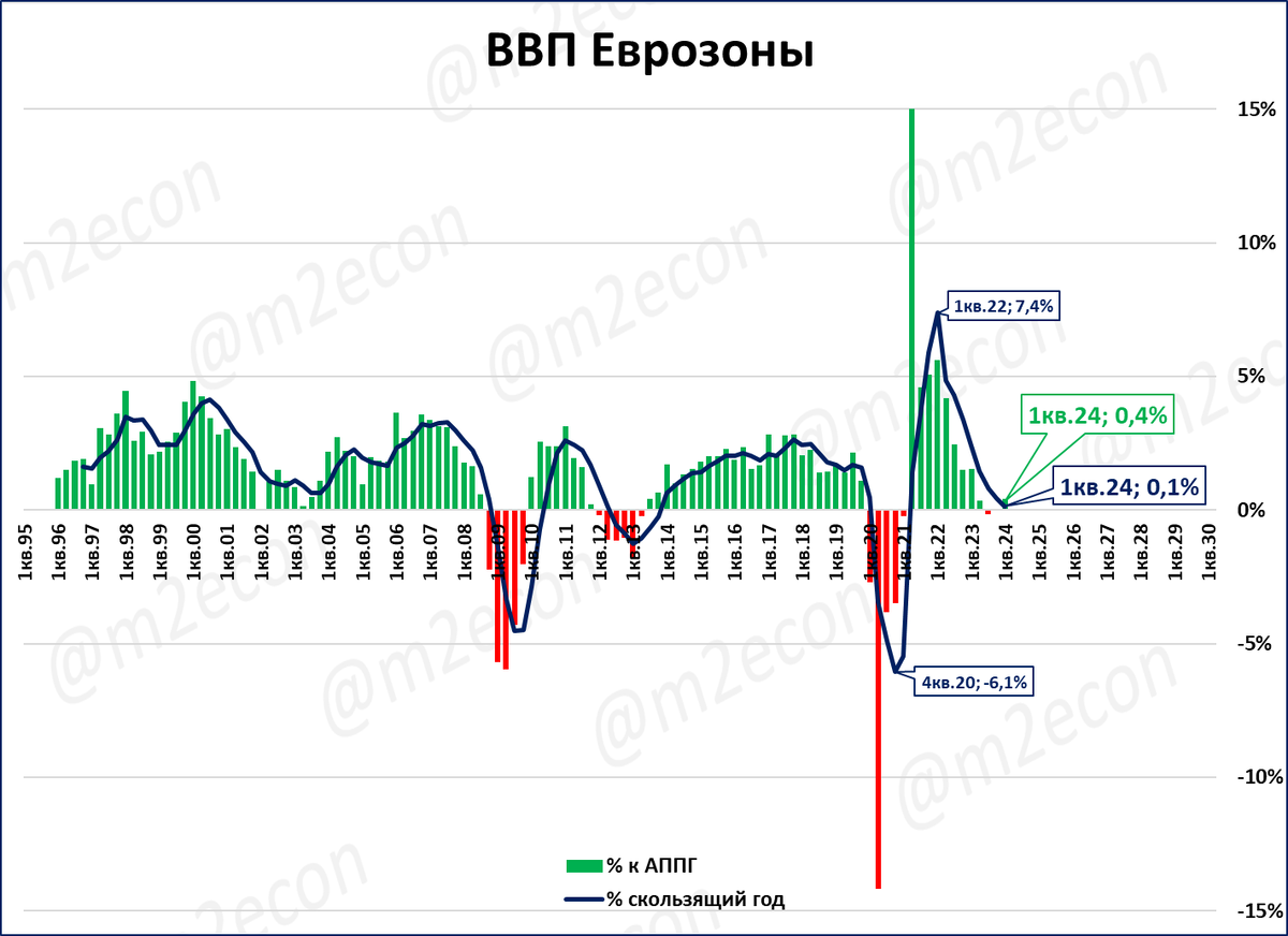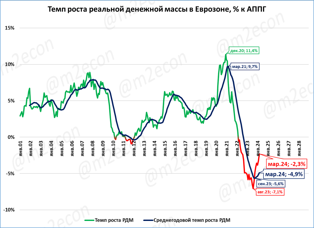 Экономика Еврозоны продолжает стагнировать, рост в 1 квартале составил около +0,4%. Реальная денежная масса сжимается, но уже не так быстро, как раньше.