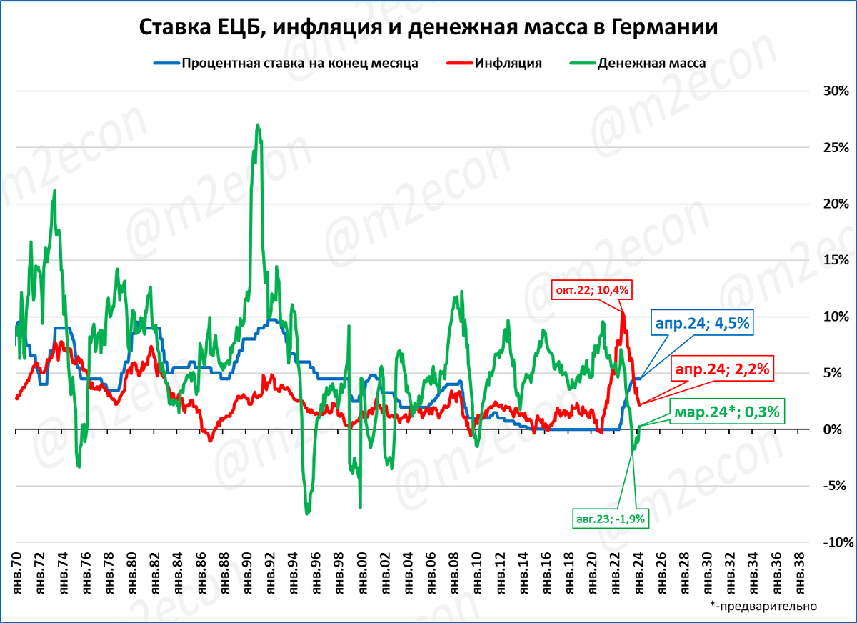 Экономика Германии: в 1 квартале падение ВВП Германии ускорилось до - 0,9%. Это четвёртый квартал падения подряд. Падение реальной денежной массы продолжается с марта 2022 года.