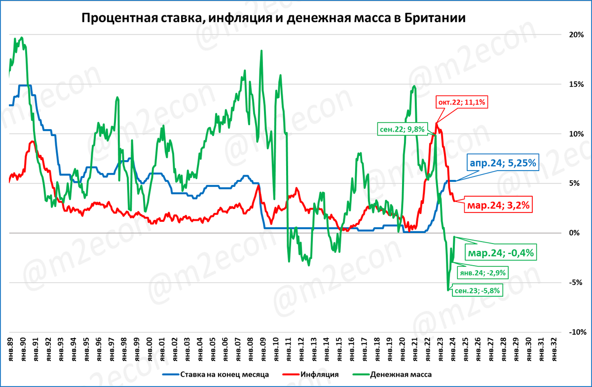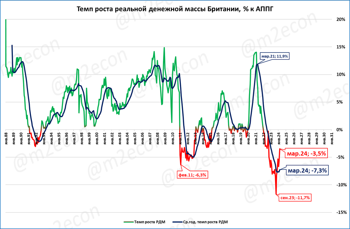 Британия: падение денежной массы замедляется. Реальная денежная масса в марте сжалась до -3,5%, к марту прошлого года. Падение РДМ продолжается с февраля 2022 года.