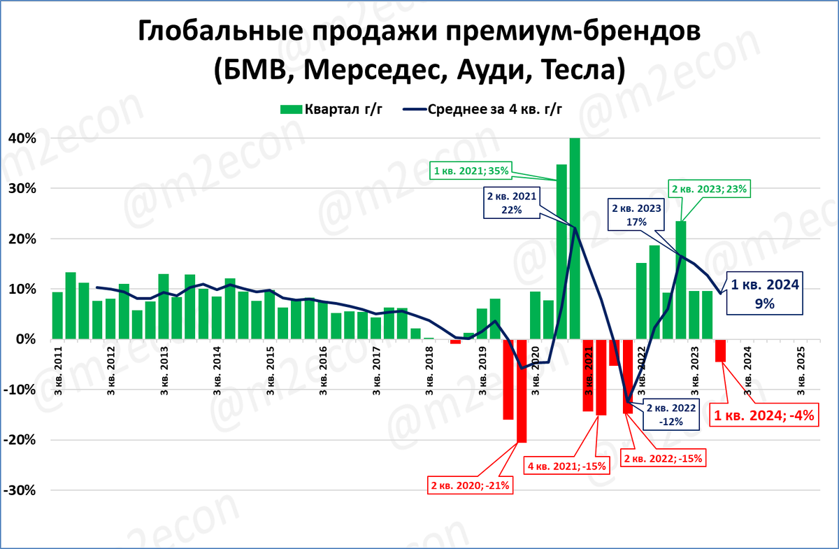 Премиум-авто: продажи в 1 квартале начали падать. Падение продаж премиум-автомобилей наблюдается редко. Такое случалось в 2008-2009 годах (Великая рецессия) и в 2020 году (пандемия).