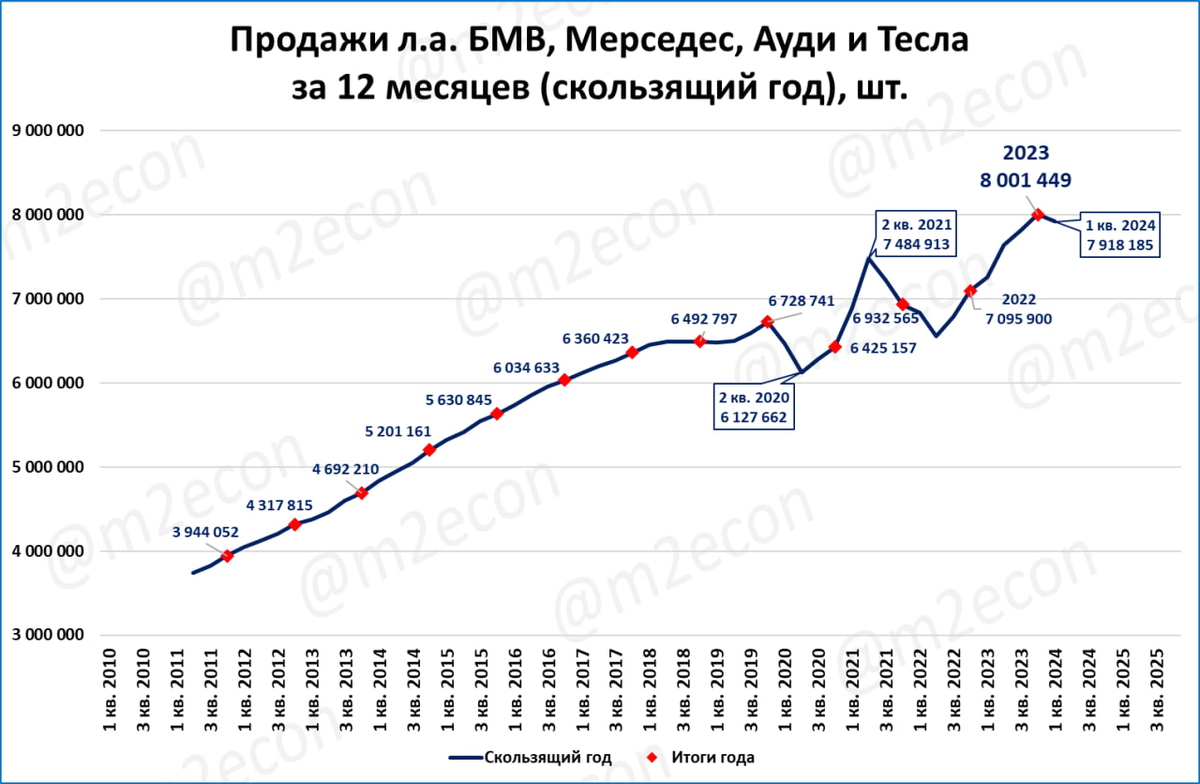 Без Теслы продажи только трёх немецких марок давно стагнируют. Сейчас они на уровне 2017 года.