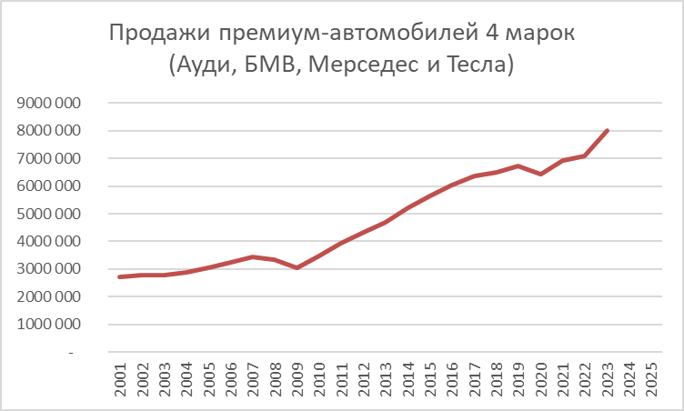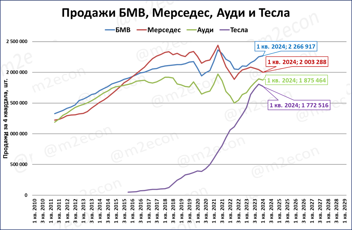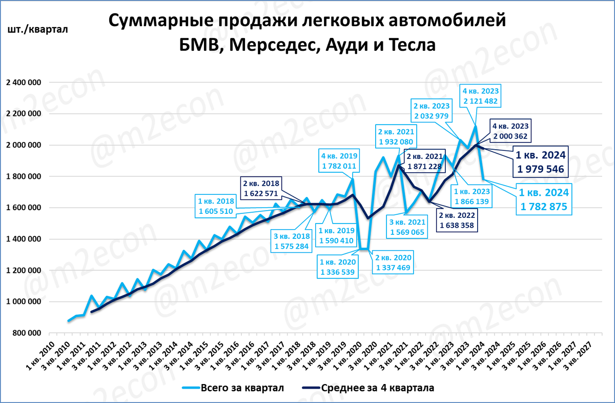 В 1 квартале 2024 года продажи четырёх производителей премиум - автомобилей (Ауди, БМВ, Мерседес и Тесла) составили 1 783 тыс. шт.
