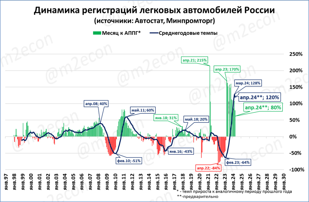 2. 📈 Рынок легковых автомобилей в России вырос в апреле на 80%, а по итогам года может стать лучшим за 10 лет.
