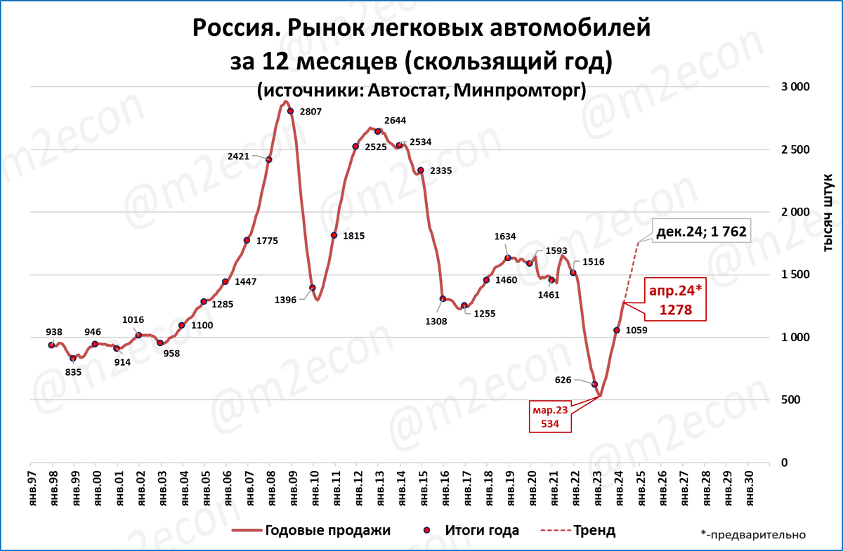 Банальное продление текущего тренда даёт итог 2024 года 1,76 млн.