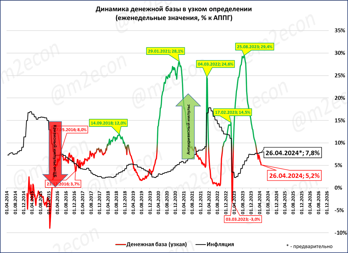 Узкая денежная база по-прежнему растёт медленнее цен, то есть, сжимается в реальном выражении (негатив).
