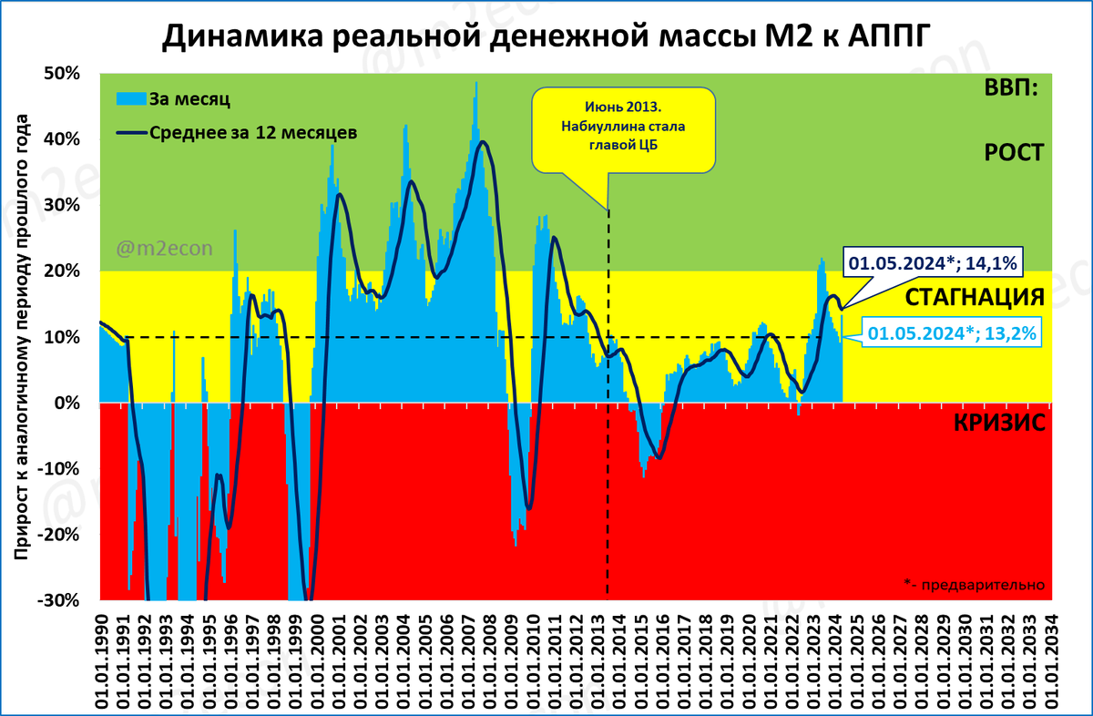 ● С 2013 года реальная денежная масса наоборот, не росла темпами выше 13% — это стало своеобразным "потолком Набиуллиной".