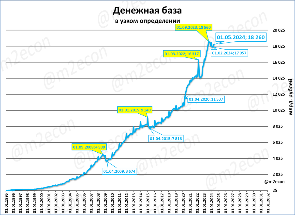 На 1 мая 2024 года узкая денежная база (УДБ) составила 18,3 трлн рублей.