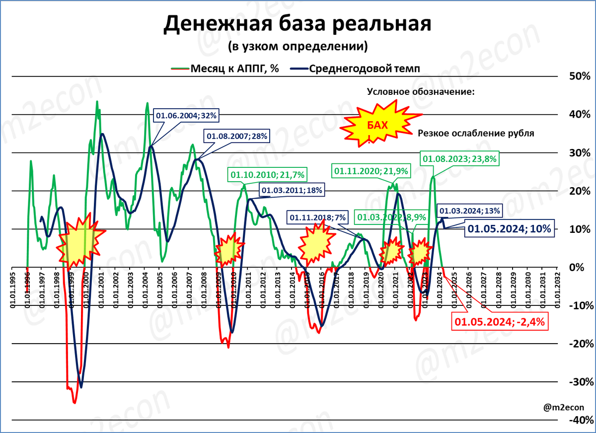 Обратите внимание на среднегодовые темпы. С 16,2% в конце 2023 года они скатились уже до 14,1%. По текущему тренду (см. пунктир на графике), к концу года среднегодовые темпы снизятся до 9,5%.